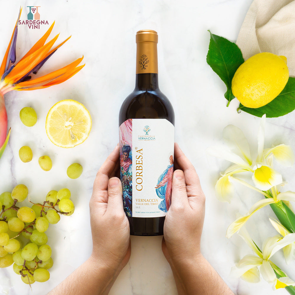 - Corbesa Vernaccia Valle de Tirso IGT, un vino dorato e aromatico, per un regalo unico e memorabile. Con etichette dipinte da Carlo Contini