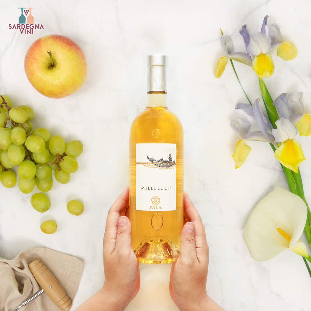 Perlas Nuragus di Cagliari 2024 wine bottle from Cantine di Dolianova with elegant label design and pale yellow liquid.