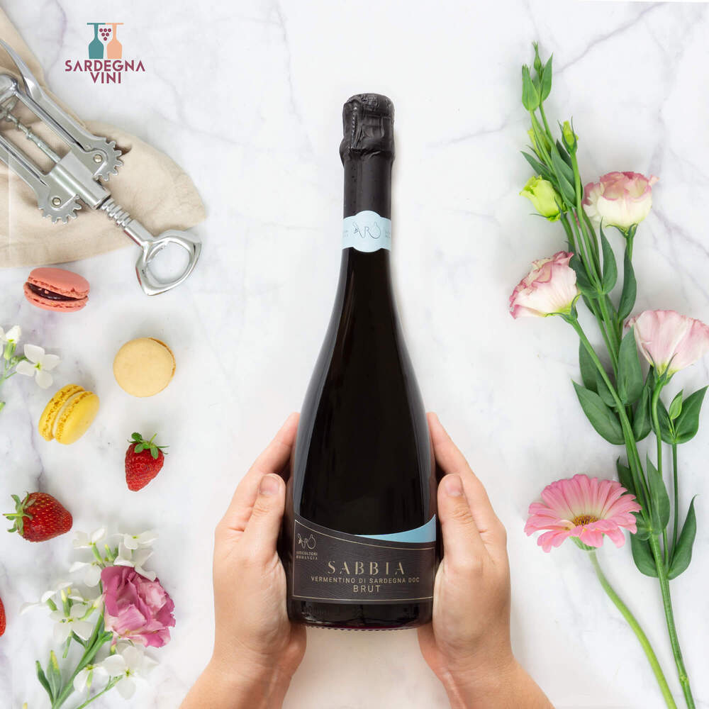 Sabbia Vermentino di Sardegna 2023 bottle with white wine in a glass, showcasing the brand Viticoltori Romangia.