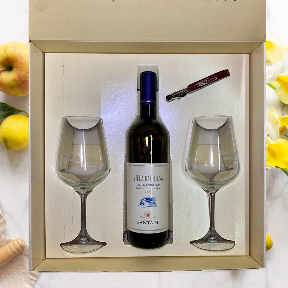 I calici e l'elegante apri bottiglie inoltre, sono un complemento ideale per gustare al meglio questo vino, grazie alla loro eleganza e raffinatezza. Confezionata con cura in una scatola regalo di alta qualità, questa composizione rappresenta un regalo unico ed indimenticabile, perfetto per celebrare momenti speciali e rendere ancora più curati vostri momenti di relax e convivialità.